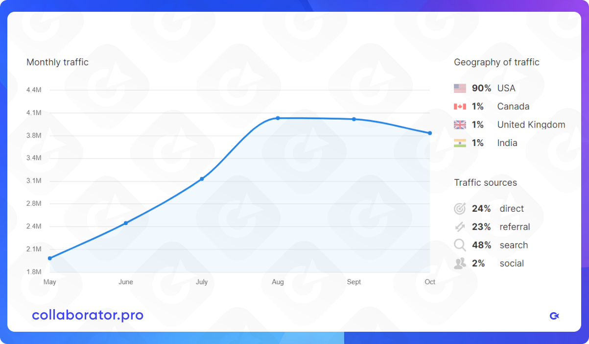 You can easily promote projects to a specific locale. Data on traffic distribution by countries is available in the catalog and on the platform’s page. It can greatly speed up the process of selecting and analyzing websites.