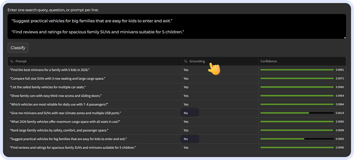 Просто вставте свій список у поле, натисніть кнопку «Classify» — і ви миттєво побачите, які запити є grounded (обґрунтованим), а які ні: